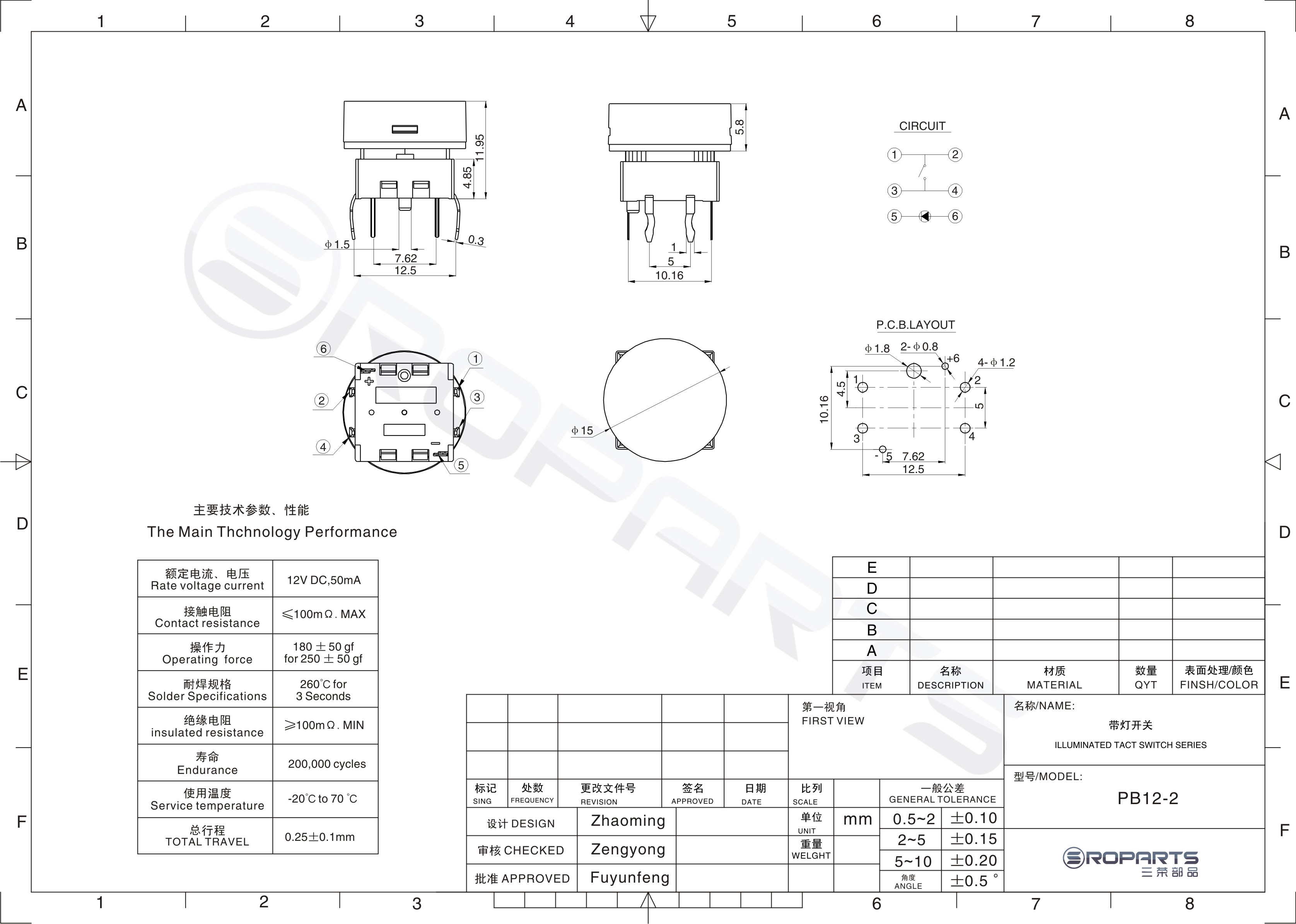1. 額定電流、電壓: DC 12V 50mA   2. 接觸電阻: ≤100mΩMAX