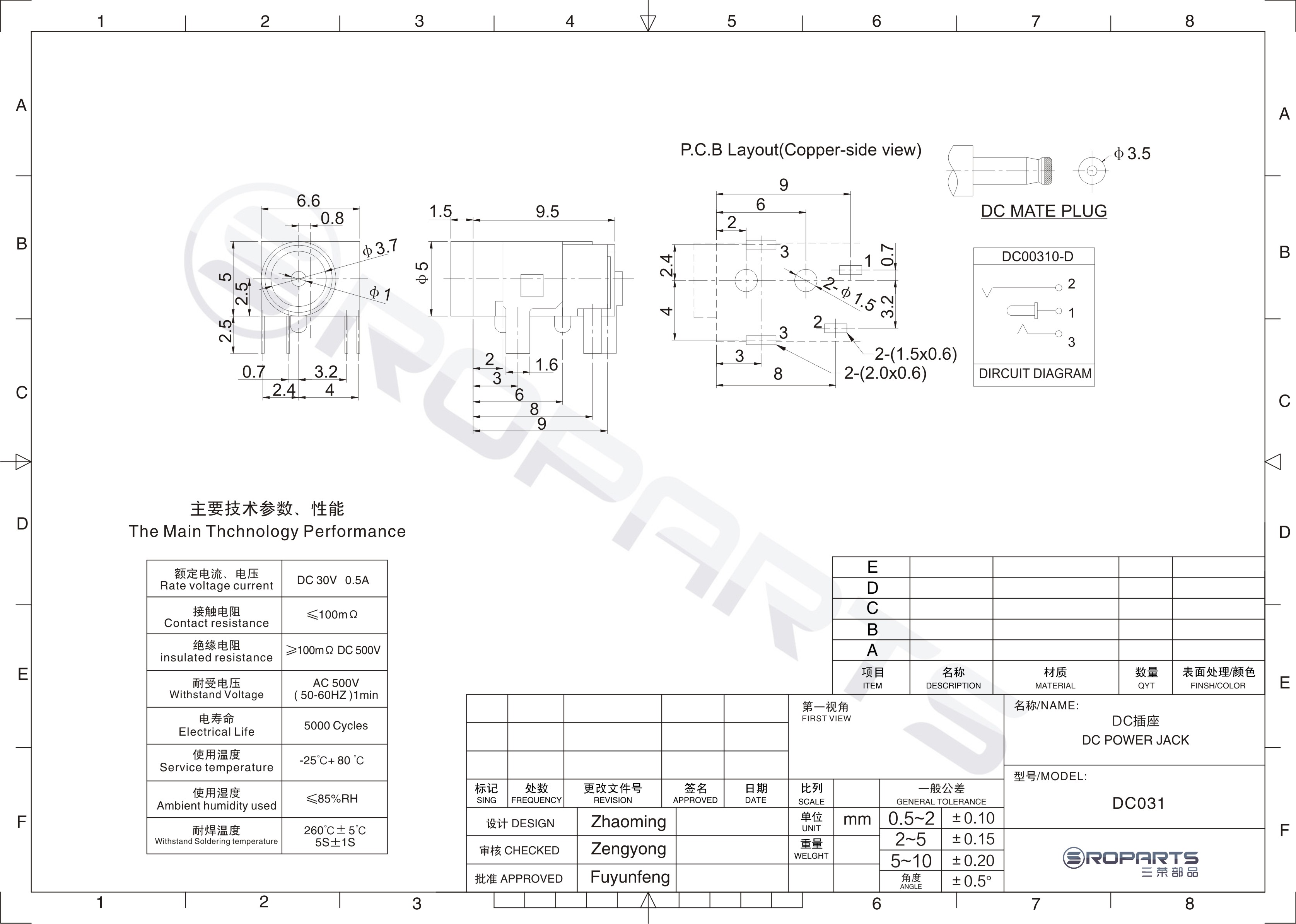 1. 額定負荷: DC 30V 0.5A 2. 接觸阻抗: ≤100mΩ