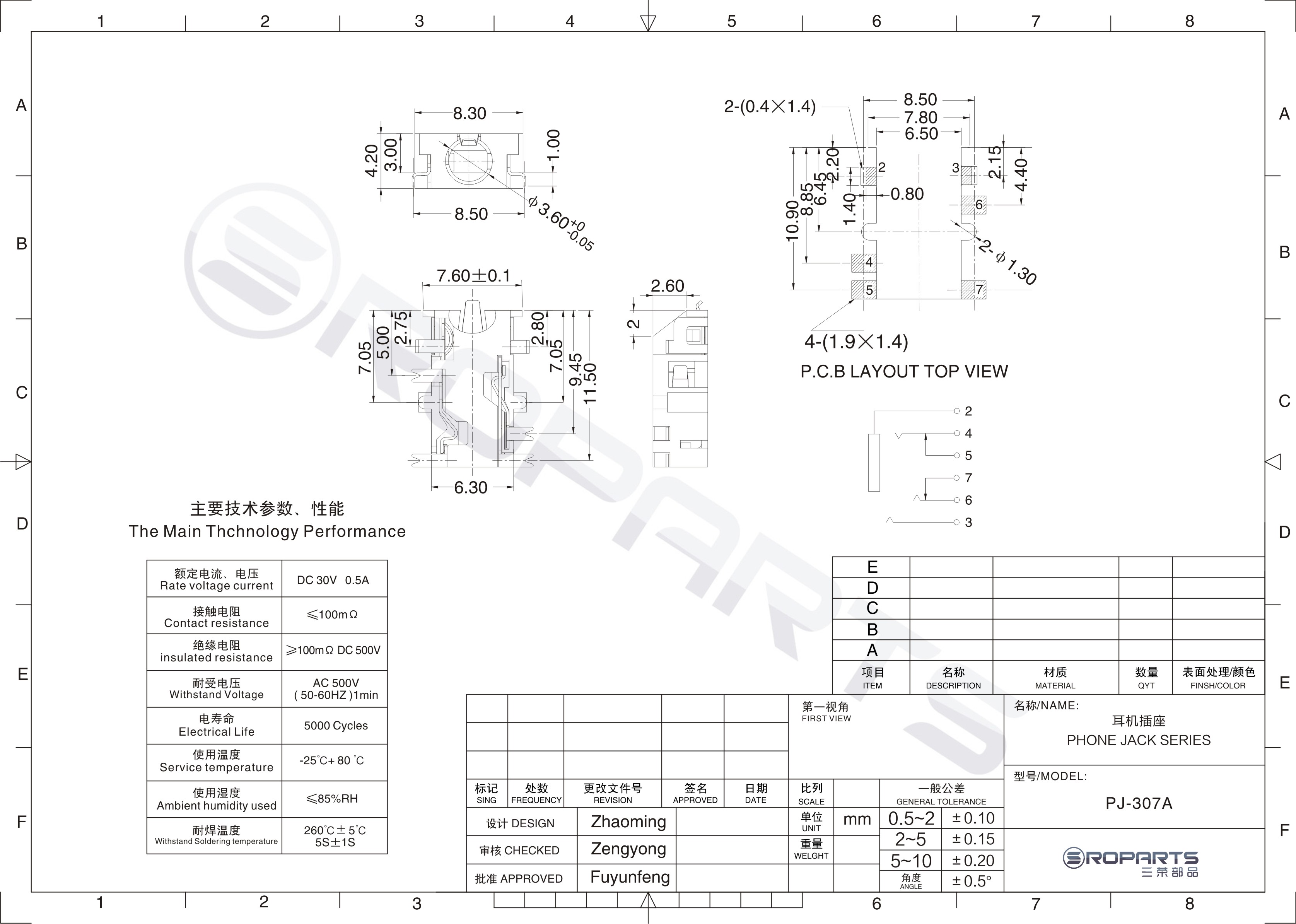 耳機(jī)插座技術(shù)參數(shù):